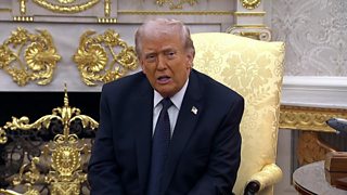 Getty Images Trump and Starmer sit at black desk with black microphones. A purple coloured screen behind them has small UK and US flags pressed into it. Starmer is wearing a black suit and patterned tie with a white shirt. Starmer is looking ahead with his hands crossed over one another. Trump is looking straight ahead and appears to be scowling. He is wearing a navy suit with a red tie and a white shirt.Getty Images